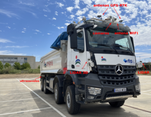 La siguiente figura presenta el conjunto de sensores instalados en el camión, cuya integración permite habilitar el sistema de conducción autónoma en la cantera y llevar a cabo de forma eficiente las operaciones de carga y descarga.