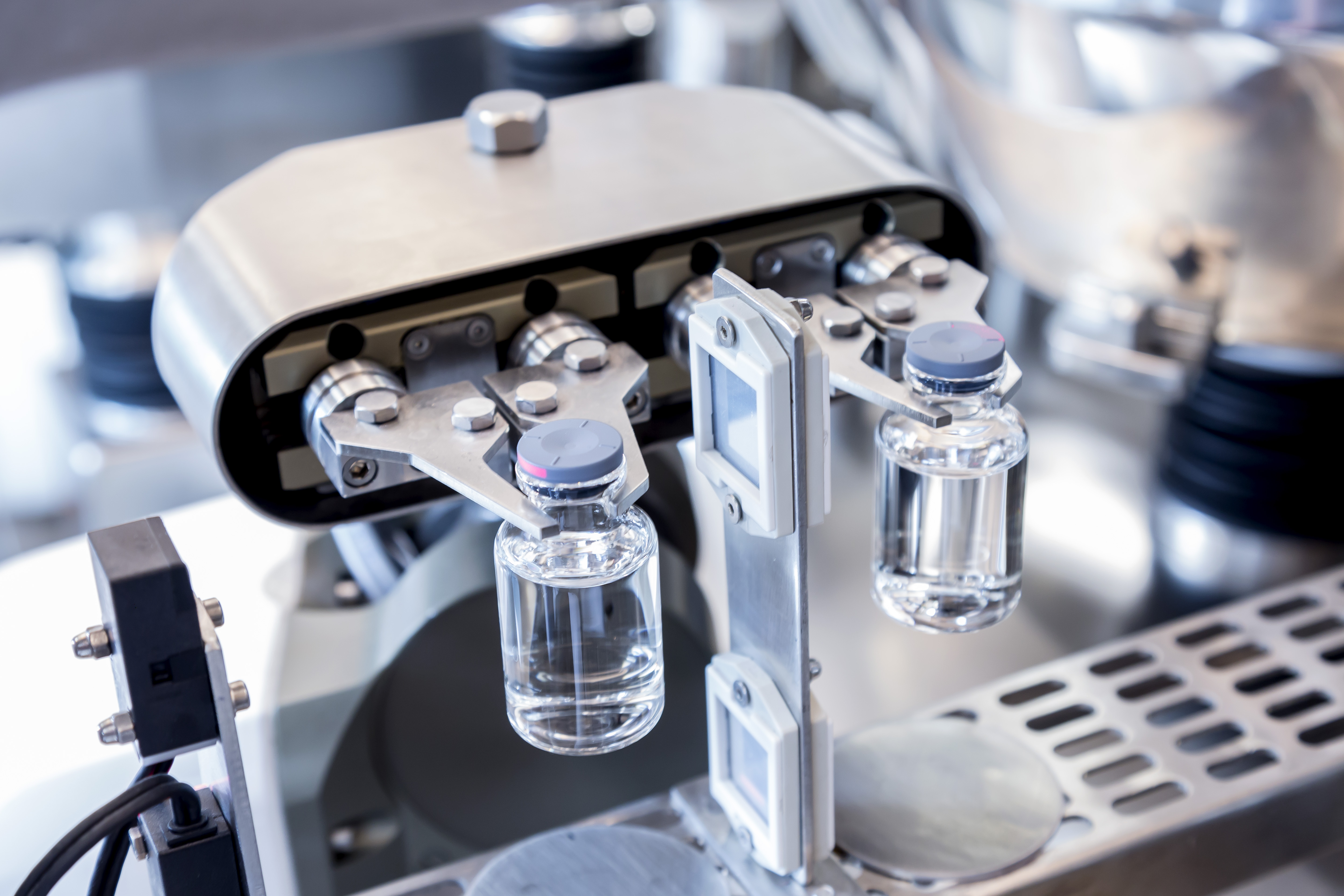 La PGN-Plus-P es un gripper libre de mantenimiento de por vida, en la imagen cuenta con revestimiento personalizado para la manipulación de frascos de medicamentos en un sistema de llenado aséptico. Imagen: Steriline